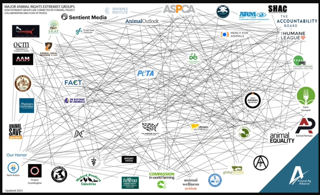 The following image shows how major animal rights organizations and extremist groups are connected through funding and collaboration, projects, and flows of people: